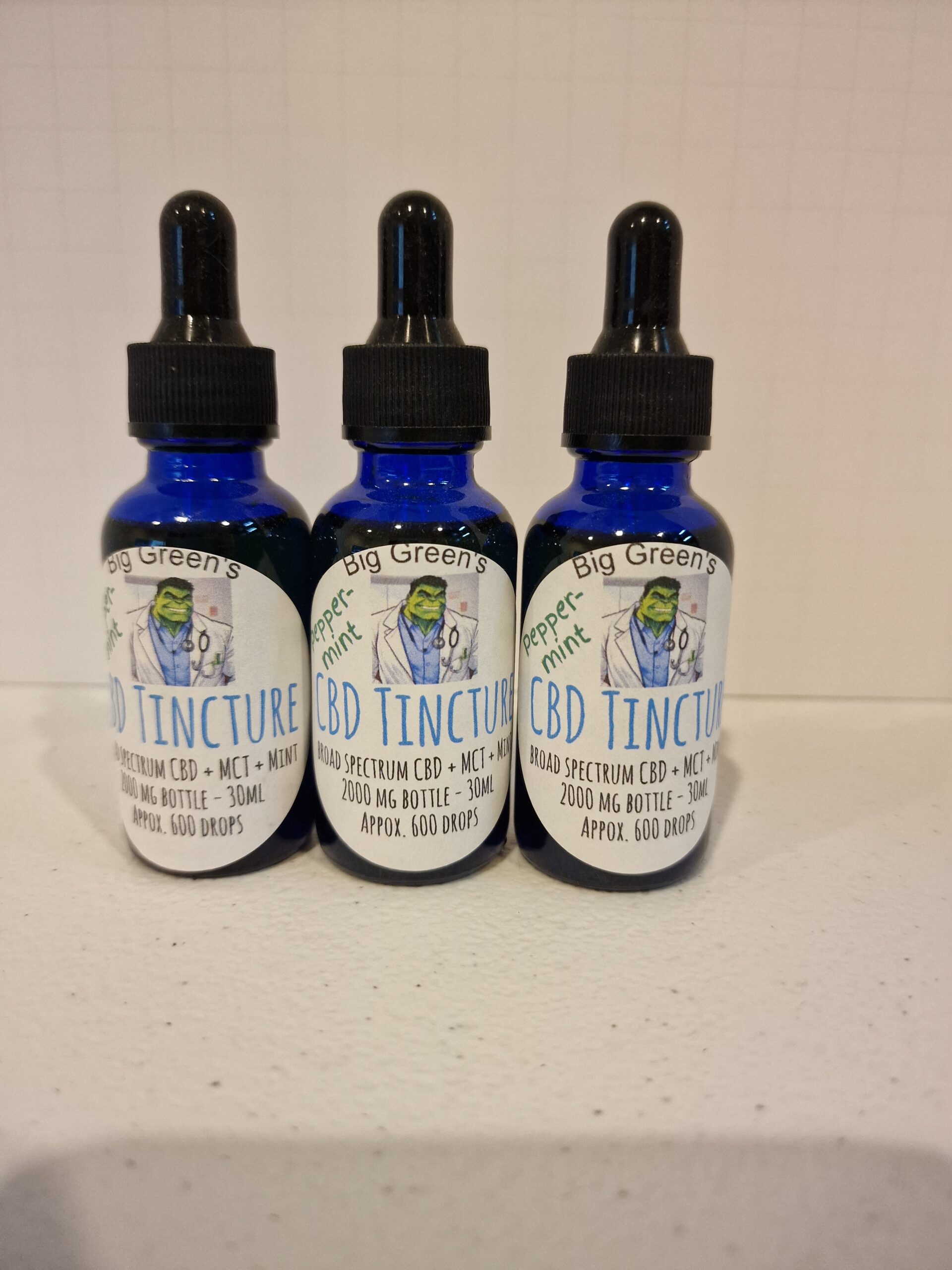 Big Green’s cbd tinctures are alcohol free and small batch blended using organic cold pressed mct coconut oil and broad spectrum cbd extract derived from cbd potent cannabis strains, not hemp. These tinctures provide the highest quality effects and health benefits. Available in natural and peppermint flavors. 2000mg – 30ml bottles (approx 600 drops)